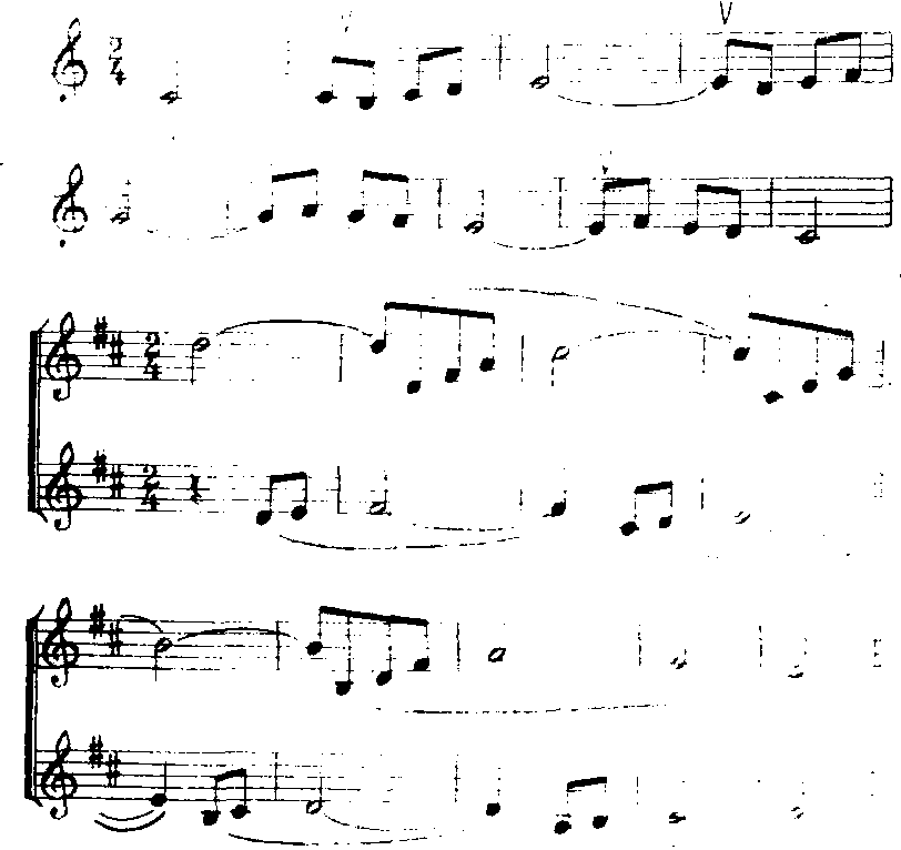 这一练习的要求是:连音要尽量连,该断开的音一定要轻巧、灵活地断开。这是合唱队员学习歌唱技巧的一个基础。