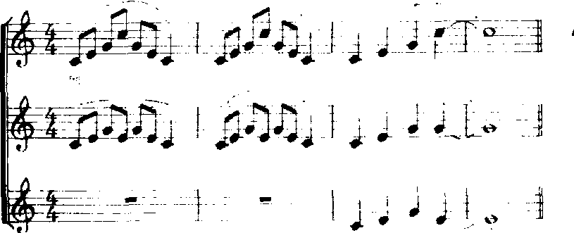 在一般情况下,合唱队的排练都是由发声练习开始的。目的是使学生很快进入到排练所需要的歌唱状态。通过发声训练,使学生掌握基本的方法、歌唱技巧。特别是合唱队多声部的发声练习,可以训练队员对音高、节奏的辨别的能力。常用练声曲如下: