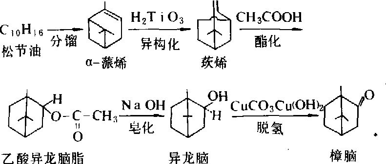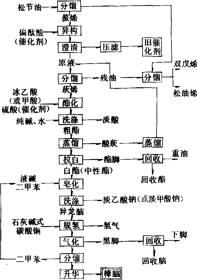 从上列反应式可以看出,同分异构化法合成樟脑可以分成以下几个基本工序:松节油的分馏,蒎烯的异构,莰烯的酯化,酯的皂化,异龙脑脱氢和樟脑的提纯。合成樟脑生产示意流程如下图。