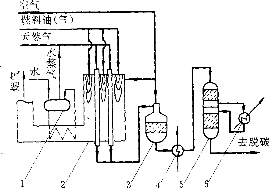 1 中压废热锅炉 2 一段转化炉 3 二段转化炉4 高压废热锅炉 5 CO变换器 6 低压废热锅炉