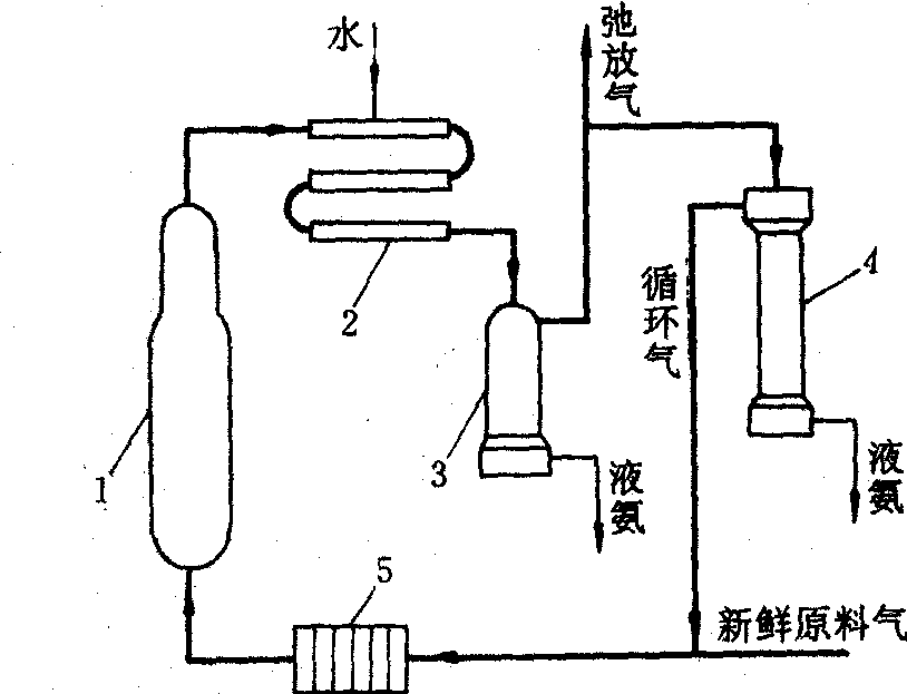 1 合成塔 2水冷凝器 3氨分离器4氨冷凝器 5离心式压缩机