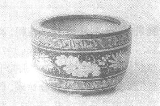 | 释义 | 吉州窑彩绘莲荷纹三足瓷炉南宋。通高6.7厘米,口径10.4厘米。1970年江西省南昌市出土。江西省博物馆藏。炉平口,鼓形腹,矮三足,共有四组纹饰。炉口绘白地酱褐色的卷草纹;器身上下各绘一周回纹,其彩绘方式与卷草纹相同。主题纹饰绘于器腹,以褐彩作地,画白色穿枝莲花。四组纹饰凑在一起疏密得当,既严谨,又活泼。所采用的白地褐彩和褐地白彩两种画法,绘制时颇费工夫,是吉州窑罕见的佳作。吉州窑见“吉州窑荷叶纹瓷瓶”条目。