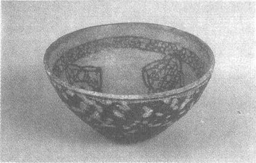 | 释义 | 吉州窑黑釉剪纸文字纹玳瑁皮瓷盏宋。高5.7厘米,口径11.2厘米。江西省博物馆藏。盏敞口,深腹,小平底,盖外壁施玳瑁釉。所谓玳瑁釉是一件器物用两种氧化铁含量不同的釉料,两次施釉,两次焙烧,使釉面成为黑、黄等色交织混合玳瑁状的斑纹。盏内浅黄色的釉面上有黑色“长命富贵”、“福如东海”等剪纸纹,极富新意。剪纸艺术在民间流传已久,人们把对美好事物的赞美和幸福生活的向往,用剪纸艺术加以表现,而吉州窑工匠又将它移植于瓷器的装饰中,产生了别具民间格调的瓷器品种,成为吉州窑的特色产品。吉州窑见“吉州窑荷叶纹瓷瓶”条目。