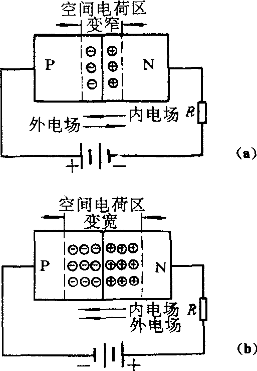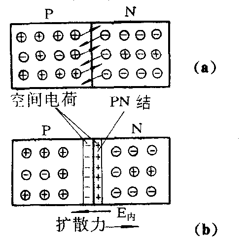 由于P区有大量可以移动的空穴,N区几乎没有空穴,二者存在空穴浓度差,空穴从浓度高的P区向N区扩散。同样,N区有大量的自由电子,P区很少,二者间存在自由电子的浓度差,自由电子从浓度高的N区向P区扩散,如图1中箭头所示。可将这种扩散运动理解为一种扩散力。随着扩散的进行,P区空穴减少,P区出现了一层带负电的粒子区(图1(b)中用“-”号表示不能移动的受主原子);同时N区的电子减少,N区出现一层带正电的粒子区(图1(b)中用“+”表示不能移动的施主原子),这样,在交界面的左侧和右侧,分别出现了负电荷和正电荷的空间电荷区。这些负、正空间电荷在交界面产生一个电场,电场方向从右指向左端,如图(b)E内箭头所示。这个电场力阻碍正电荷从左向右扩散运动,同时阻碍电子从右向左扩散运动。或说,电场力迫使空穴和电子沿与扩散运动相反的方向运动。通常把载流子在电场作用下的运动称为漂移运动。随着扩散的进行,交界处的空间电荷区加深,E内增加所引起的漂移运动也增加,最后,当浓度差所引起的扩散运动与E内所引起的漂移运动相等时,空间电荷区将稳定下来而不再增加。这个空间电荷区,因其载流子数目很少,故又称为阻挡层或耗尽区,PN结就是指的这个阻挡层。
