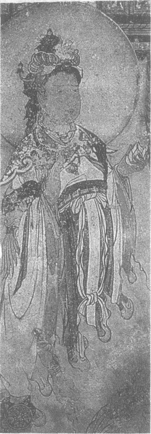 | 释义 | 吉祥天图壁画元。甘肃省敦煌县莫高窟第3窟北壁西侧壁画。吉祥天又名辩才天,功德大,是帝释天之女,多闻天之妃,聪慧有辩才,善歌詠,司国家安泰及个人福德。图中吉祥天梳高髻,戴花冠,着云肩羽袖大带裙襦。左手捧莲花,右手扬起作施与状。她的面庞丰圆,五官精巧秀丽,双眉紧锁,凝视前方,一副若有所思的神态,俨然是一位端庄、聪颖女子形象。人物轮廓线条圆润,衣纹舒展自然,具有飘垂的质感,是一幅优秀的人物肖像画。