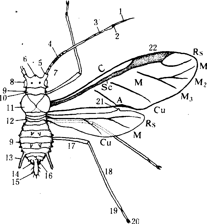 胸喙亚目 喙似起于前足基节之间,跗节1或2节,触角长而线状,无端芒,若干种类无触角,翅脉常退化。雌虫一般无产卵器,不能把卵产在植物组织内,全是不善活动的种类。这个亚目是个广泛的人为类群,目前可分为4个总科: 木虱总科 体长仅3毫米左右,形似小蝉,比较活泼,触角9~10节,一般10节,端节有2细毛,喙分3节,跗节2节,翅脉退化。雌虫除保留有3对产卵瓣外,生殖节背腹板成鸟喙状。后足腿节膨大,能跳跃。常见种有为害桑树的桑木虱可使幼叶卷缩,甚至枯落:为害梨和苹果树叶的梨木虱等(见梨木虱)。 粉虱总科 体长仅1~2毫米。身体和翅上被有白蜡粉,单眼2个,位于复眼的上方,触角7节,喙3节,跗节2节,翅脉甚退化。若虫4龄,第一龄活泼、可以爬行,第二至四龄固定于植物上不活动,很像介壳虫,4龄若虫后期不取食,近似于“蛹”,称“伪蛹”。可进行产雄或产雌的孤雌生殖,经交配的雌虫所产未受精卵孵化为雄虫,受精卵孵化为雌虫,而未经交配的雌虫,所产的卵均孵化为雌虫。重要害虫有烟粉虱、黑刺粉虱和温室白粉虱等,其中温室白粉虱在保护地及其附近的蔬菜和花卉等植物上为害甚重。 蚜总科 体长1~7毫米,大都2毫米左右。触角3~6节,喙4或5节,跗节2节,第一节甚小,有时跗节仅1节甚至退化。有翅型具翅2对,翅脉退化,有翅痣。腹部第五或六背片常有一对腹管,一般缺产卵器(图2)。若虫4~5龄。