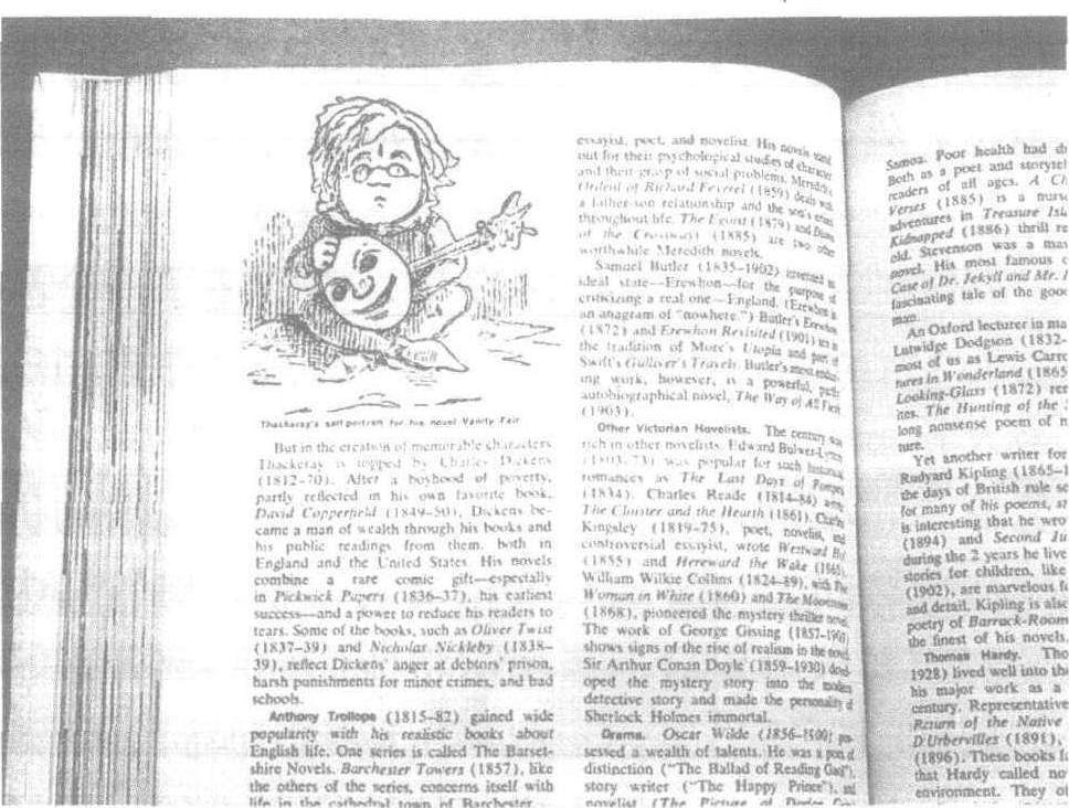 萨克雷为他的小说 《名利场》 所作自画像 作者以巨大的艺术力量塑造了 一个极端冷酷自私、阴险毒辣的小资产阶级女野心家和钻营者利蓓加的形象,并以其冒险生涯为主要线索,将各类贵族、资产阶级代表人物连成艺术整体,深刻揭露了以金钱权力为中心的英国资本主义社会人与人之间赤裸裸的利害关系。小说在创作方法上力求真实,深刻描写了人物的内心活动,重视环境和性格的相互关系。作者采用讲故事的叙述方法,亲切随便,夹叙夹议,冷嘲热讽,形成一种独特的风格。