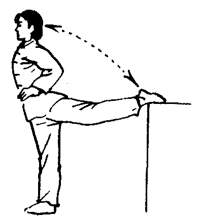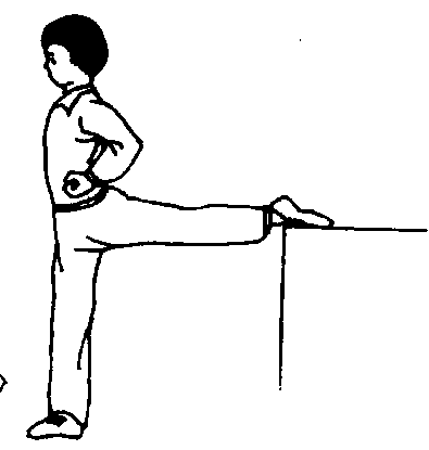 后压腿腿功之一。背对肋木或一定高度物体,并步站立,两手叉腰或扶一定高度的物体。一腿支撑,另一腿将脚背放在肋木上,脚面绷直,上体后屈并做后压动作。练习时,要求两膝挺直,支撑腿全脚着地,挺胸、展髋,腰向后屈。(图2—4—8)此方法可以帮助拉长腿部肌肉,提高柔韧性,注意练习时要左右腿交换进行。