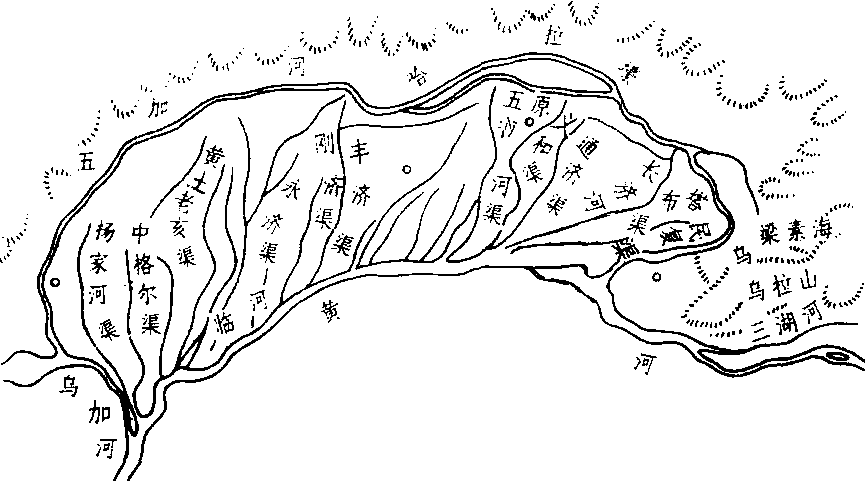 后套八大渠略图 后套八大渠清代黄河后套8条引黄灌渠。位于今内蒙古自治区巴彦淖尔盟,西起乌兰布和沙漠,东至乌拉山,南临黄河,北界乌加河。自西而东依次是: 永济渠(又名 “缠金渠” )、刚目渠(又名 “刚济渠” )、丰济渠、沙河渠(又名“永和渠” )、义和渠、通济渠(原名 “老郭渠” )、长济渠(又名 “长胜渠” )和塔布渠。各渠都自黄河引水,退水到乌加河。 |