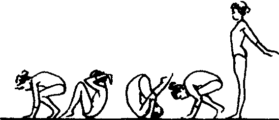 保护与帮助 保护者蹲立在练习者侧后方位置,当练习者肩、背着地时,两手扶其腰部向上提拉助其翻转。 教学重点 ❶臀、腰、背、头依次着垫滚动。 ❷后倒时,低头、含胸,两臂翻肘早撑垫。 |