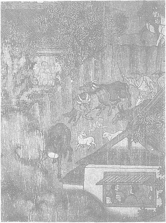 | 释义 | 后稷降生图(畜圈育婴)壁画明。纵134厘米,横97厘米。山西省新绛县稷益庙正殿东壁壁画。传说有邰氏之女姜嫄踏巨人脚印,怀孕生后稷,以为不祥,一度将他抛弃,但后稷得到牛羊喂乳,飞鸟保护,得以生存。后稷降生图即以连环画的形式再现了他的出生过程。此图为其中之一幅。画面上有一个三面夯土墙和一面房屋墙壁所围的畜圈,圈中一农夫在驱赶满圈的牛、羊、马、驴等出圈。一赤身露体的婴儿半趴在圈中,并未痛苦啼哭,而是安稳平静,甚至带一丝微笑。在农夫木棍的驱使下,满圈的牲畜无奈地绕着畜圈奔跑。婴儿被安排在画面的中间部位,他那安详、宁静的身姿与周围奔跑、暴躁的牲畜形成强烈对比,张弛关系处理得当。加之画面设色深沉古雅,人物和牲畜通过晕染而富于质感和表现力,在明代寺庙壁画中是一幅艺术价值很高的作品。