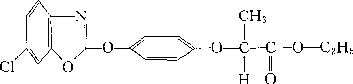 唑灵fenoxaprop ethyl又称骠马。 苯氧基类内吸苗后除草剂。由除草活性部分对乙基苯氧丙酸与安全剂复合而成。 有效成分的化学名称:乙基(R)-2-〔4-(6-氯苯并唑-2-基氧)-苯氧基〕丙酸盐。化学结构式如下。有效成分原药为无色、无臭晶体,密度1.3 (20℃),熔点85~87℃,20℃时蒸气压529.29×10-9 Pa。微溶于水,可溶于多数有机溶剂。有效成分可被植物的叶、茎迅速吸收,并输导到叶基和茎、根部的生长点。对乙基苯氧丙酸进入植物体内,迅速转化成苯氧基丙酸的游离酸,抑制脂肪酸的生物合成,使根、茎部生长点细胞膜形成受阻,导致植物死亡。对乙基苯氧丙酸进入小麦体内,在安全剂作用下很快分解成无生物活性的代谢物,从而防止作物受到危害。只适用于小麦、黑麦,可防除看麦娘、野燕麦、早熟禾、虉草、稗、千金子、狗尾草、黍等多种禾本科杂草,对阔叶杂草无效。对人、畜低毒,大鼠急性口服为LD502 090~3 040 mg/kg,急性经皮LD50>2 000 mg/kg。对鸟、鱼低毒,对蜜蜂无毒。