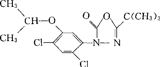 草酮oxadiazon又称农思它、草灵。有机杂环类内吸、选择性除草剂。化学名称:5-特丁基-3-(2,4-二氯-5-异丙氧苯基)-1,3,4-二唑啉-2-酮。 化学结构式如下。原药为白色无气味不吸水结晶,熔点约90℃,20℃时蒸气压133.322×10-6 Pa。微溶于水,易溶于甲醇、乙醇、环己烷、丙酮、苯、氯仿、二甲苯等有机溶剂。一般贮存条件下稳定性良好。可通过杂草幼芽、幼苗或地上部分吸收,并积累在生长旺盛部位,抑制生长,致使杂草组织腐烂死亡。在有光照条件下才发挥杀草作用。适 |