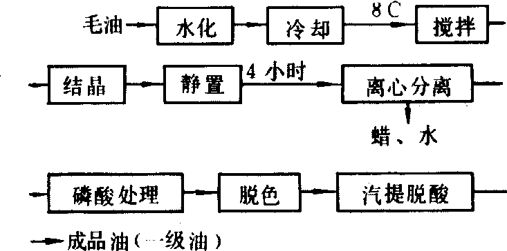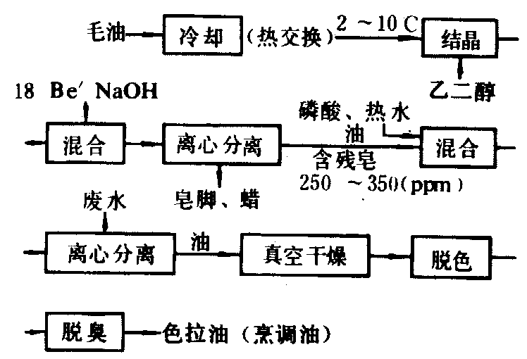 图2 色拉油连续制取工艺流程 此工艺能较有效地分离蜡质与皂脚,但油脂损耗较大,皂脚利用较差。一级食用向日葵油的间歇式或半连续式精炼工艺见图3。