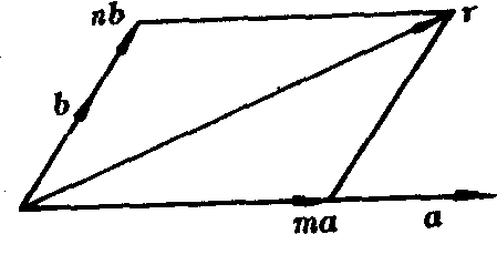 图1 这个定理表明,把不共线的向量a,b作为一个二维仿射坐标基底,则任何一个与a,b共面的向量r,都可以唯一确定地表成a,b的线性组合,或者说把r分解成了两个分别与a,b共线的向量ma和nb.见图1. 特别地,当r∥a时,r=m·a+0·b=m·a; 当r∥b时,r=0·a+n·b=n·b. 再讨论三维空间的向量分解. 定理2 若a,b,c不共面,则对于任意非零向量r,唯一存在着不全为零的m,n,l,使r=ma+nb+lc成立. 此处a,b,c构成了一个三维仿射坐标基底.