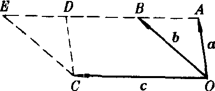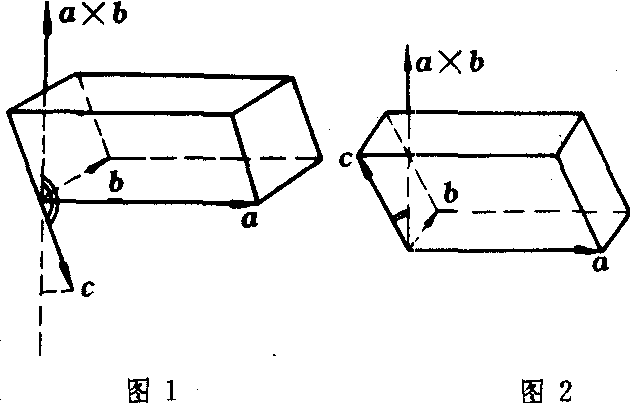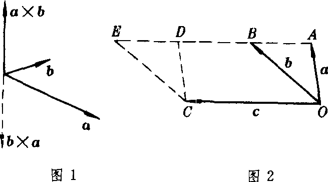 图2 ❷ 与数乘的结合律 (ma) ×b=m (a×b). ❸ 左、右分配律 a× (b+c) =a×b+a×c;(b+c) ×a=b×a+c×a. ❹ 由第3条运算律可知, ![]() 注:对于向量的向量积,消去律不成立,即若a,b,c都是非零向量,且a×c=b×c,并不能得到a=b.如图2所示, a, b, c共面, S COAD = S COBE,此时|a×c|=|b×c|,并且a×c与b×c方向相同,都是与纸面垂直向外,但a≠b. |