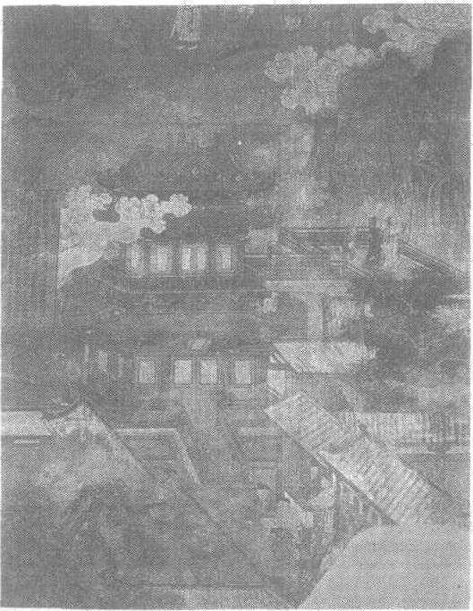 | 释义 | 吕洞宾故事图(武昌货墨)壁画元。纵180厘米,横143厘米。山西省芮城县永乐宫纯阳殿东壁北部壁画。此图的近景展示了武昌街道,街道两旁店铺罗列,杂货店中的柜台上摆放着各种瓶罐,其旁的另一店中买卖双方各在柜台内外议价。此店前一盲人在摆摊算命,一位欲知吉凶祸福的人正眉飞色舞地与算命先生探讨。街道的尽头是巍然高耸的黄鹤楼,上有云雾缭绕。楼平面呈长方形,两层,歇山顶带十字脊。楼底层设回廊,前有台阶,两层间的平座有飞梁与崇台连接。崇台上,吕洞宾等人在眺望远方,指点着远处的重山峻岭和飞流瀑布。其身后一童子陪侍。此图撷取了当时的社会生活实景,将传奇中的人物放在这一场景中,使人感到亲切,为了解当时的社会风貌提供了形象化资料。作品中人物、建筑、景物并重,尤其是建筑采用了宋元流行的界画画法,取得良好的艺术效果。