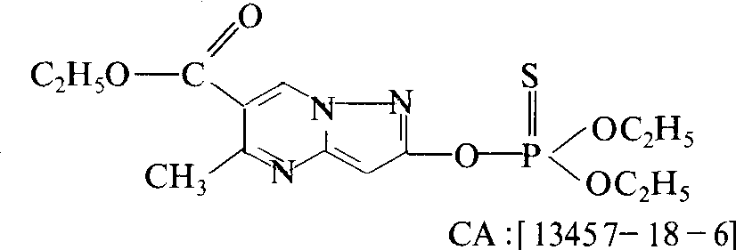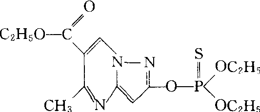 纯品为无色晶状固体。熔点51~52℃。难溶于水,20℃时溶解度为0.3%,易溶于苯、甲苯、乙醇、四氯化碳、三氯乙烷和二氯甲烷等有机溶剂。中等毒性。大鼠急性经口LD50 151~778毫克/千克。有内吸作用。对真菌中的白粉菌有特效,对长蠕孢菌等也有活性。喷雾,土壤施药或拌种,0.01 ~0.03%浓度的药液喷雾,可防治果树、蔬菜、花卉及其他经济作物的白粉病,土施或拌种,药剂能被植物根部吸收,向茎叶传导以防治病害。 吡嘧磷pyrazophos又称定菌磷。有机磷杀菌剂。化学名称:O-[6-乙氧羰基-5-甲基吡唑基(1,5a)嘧啶-2基]-O,O-二乙基硫代磷酸酯。化学结构式如下。原药无色结晶,不溶于水,易溶于苯、甲苯、四氯化碳、三氯乙烷等,性质稳定,但遇酸碱则易分解。德国赫司特公司开发,内吸性杀菌剂,用于防治果树、蔬菜白粉病,并兼有杀虫杀螨作用。以稻瘟菌试验表明,药剂经真菌代谢后转化为6-乙氧羰基-2-羟基-5-甲基吡唑并(1,5a)嘧啶(pρ),是杀菌的主要化学物质。大白鼠口服急性LD50为286~632 mg/kg、经皮LD50为>2 000 mg/kg。