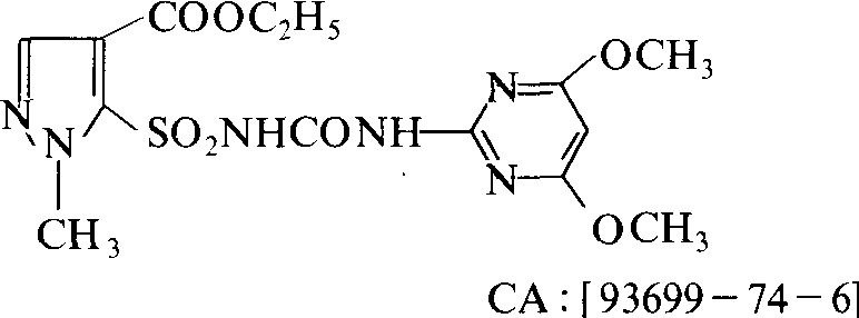 性能 原药为灰白色晶体,熔点181~182℃,蒸气压2.5×10-7×133.322帕(25℃ )。20℃时,在水、正己烷、氯仿、苯、丙酮中的溶解度分别为1.4×10-2、0.2、234.4、15.6、31.7克/升。正常条件下贮存稳定。对高等动物低毒。原药(有效成分不低于98%)雌雄大小鼠急性经口LD50均>5000毫克/千克。雌雄大鼠急性经皮LD50均>2000毫克/千克。大鼠急性吸入LC50>3.9毫克/升。对兔眼睛和皮肤无刺激作用。在试验剂量下,对动物无致畸、致突变、致癌作用。对水蚤EC50>700毫克/升。对蜜蜂LD50>100微克/只。主要被杂草根部吸收,并在体内迅速传导,抑制杂草氨基酸合成,使其芽和根很快停止发育。 应用 草克星适用于插秧田和直播田防治鸭舌草、节节菜、陌上菜、牛毛草、异型莎草、碎米莎草等一年生杂草和部分多年生杂草。在推荐剂量下对稗草有较强抑制作用。 插秧田在插后5~7天,稗草1.5叶期前施药,每公顷用10%可湿性粉剂150~300克。各地可结合草情适当增加或降低用量。拌细潮土300~450千克,均匀撒施。保持水层3~5厘米5~7天。若水层不足时可缓慢补水,但不可排水。直播田可在播种后3~10天施药。用量、方法及水层管理同插秧田。草克星与丁草胺、禾草特混用除草效果更好。其药雾和田中排水对周围阔叶作物有伤害作用,应予注意。 吡嘧磺隆pyrazosulfuronethyl又称草克星。磺酰脲类选择性内吸除草剂。化学名称:5-[3-(4,6-二甲氧基嘧啶2-基)脲基磺酰基]-1-甲基吡唑-4-羧酸乙酯。化学结构式如下。