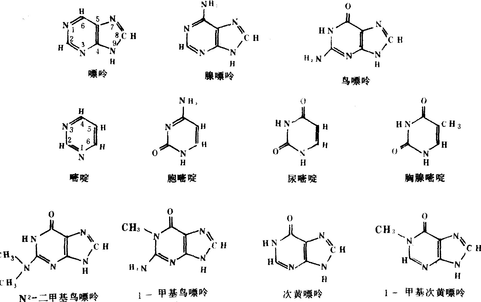 此外,还发现有几十种修饰碱基(常称稀有碱基),绝大部分是嘌呤或嘧啶的甲基衍生物,转移RNA分子中含修饰碱基较多,在其中已发现数十种修饰碱基,占已知的大部分。如次黄嘌呤、1-甲基次黄嘌呤、N2-二甲基鸟嘌呤、1-甲基鸟嘌呤等。胸腺嘧啶(5-甲基尿嘧啶)也是转移RNA的修饰碱基。它们的结构式分别如下: