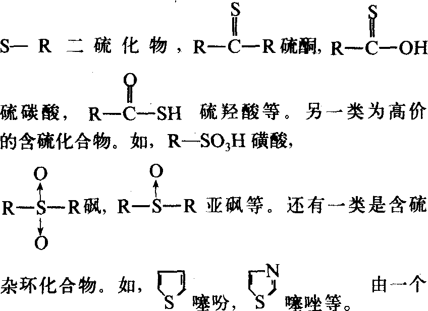 | 释义 | 含硫有机化合物hanliu youji huahewu含硫的有机化合物分3类: 一类是含氧有机物中的氧原子被硫原子代替的化合物。在这些化合物中,硫原子形成两个共价键,其命名方法与相应的含氧化合物类似。如,R—SH硫醇,Ar—SH硫酚,R—S—R硫醚,R—S—