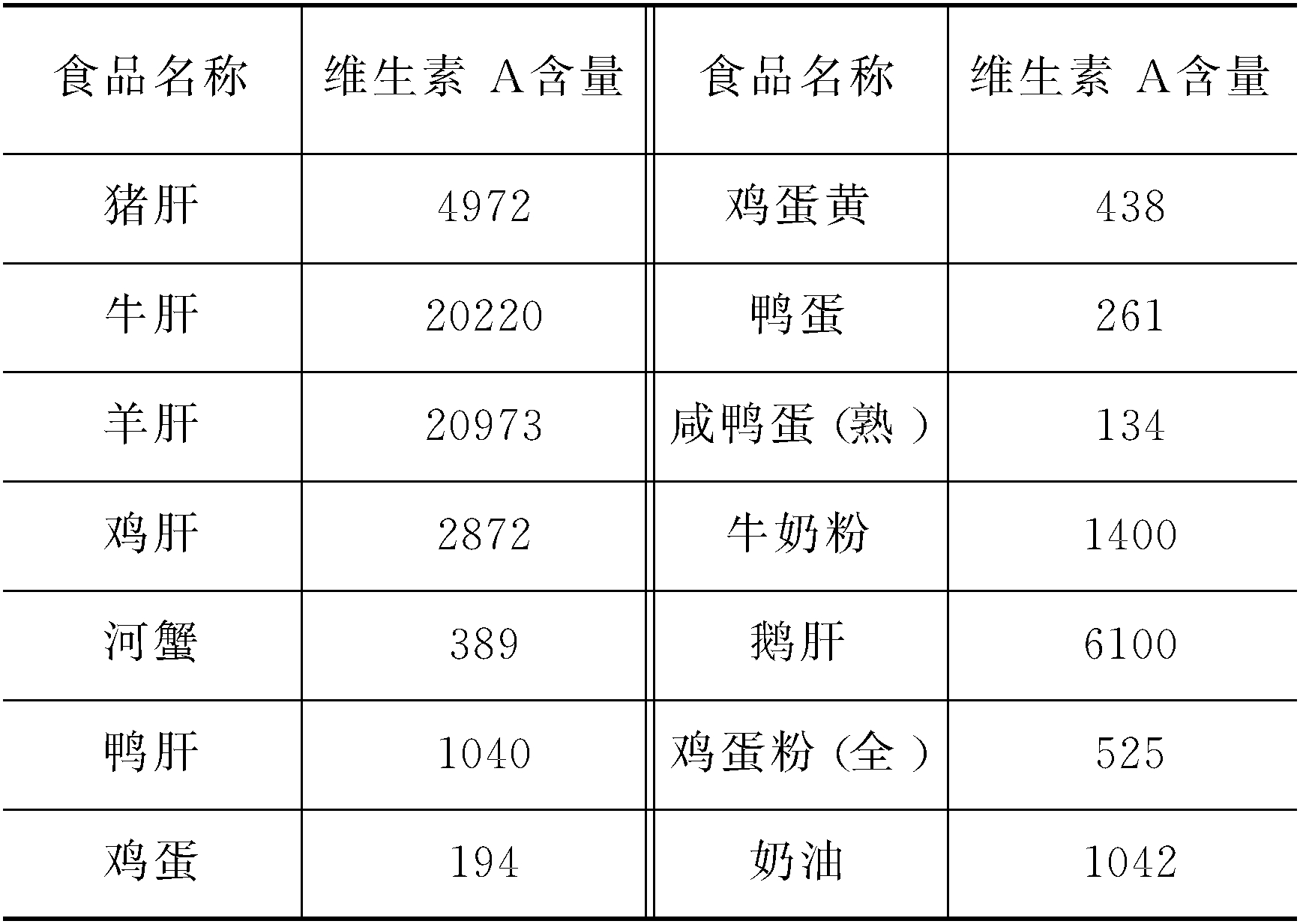 维生素A又名视黄醇。1个国际单位(IU)维生素A等于0.3 μg视黄醇。中国营养学会建议,成年人日供维生素A 800 μg,相当于2640IU,即可满足人体需要。含维生素A丰富的食物见下表(单位:IU/100g):