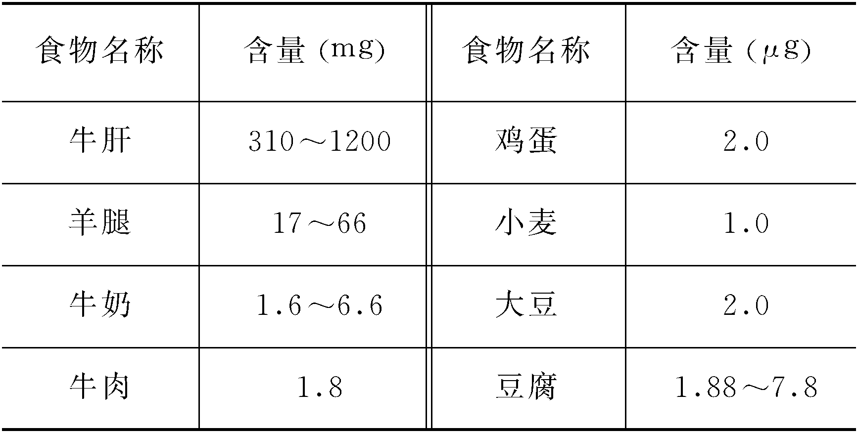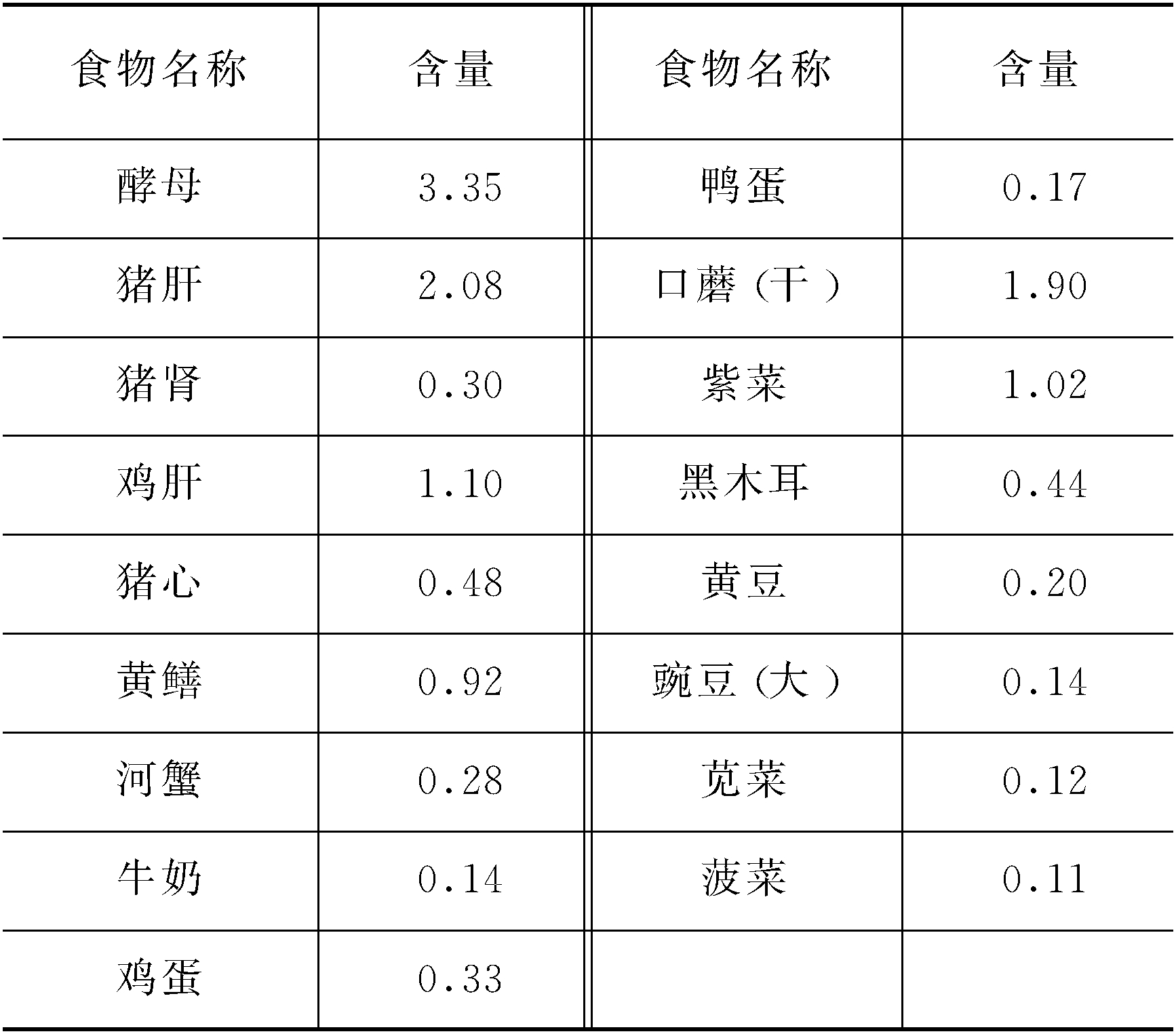 成年人每人每日需要1.2~1.5 mg维生素B2。含维生素B2较丰富的食物见下表(以100g计,单位:mg):