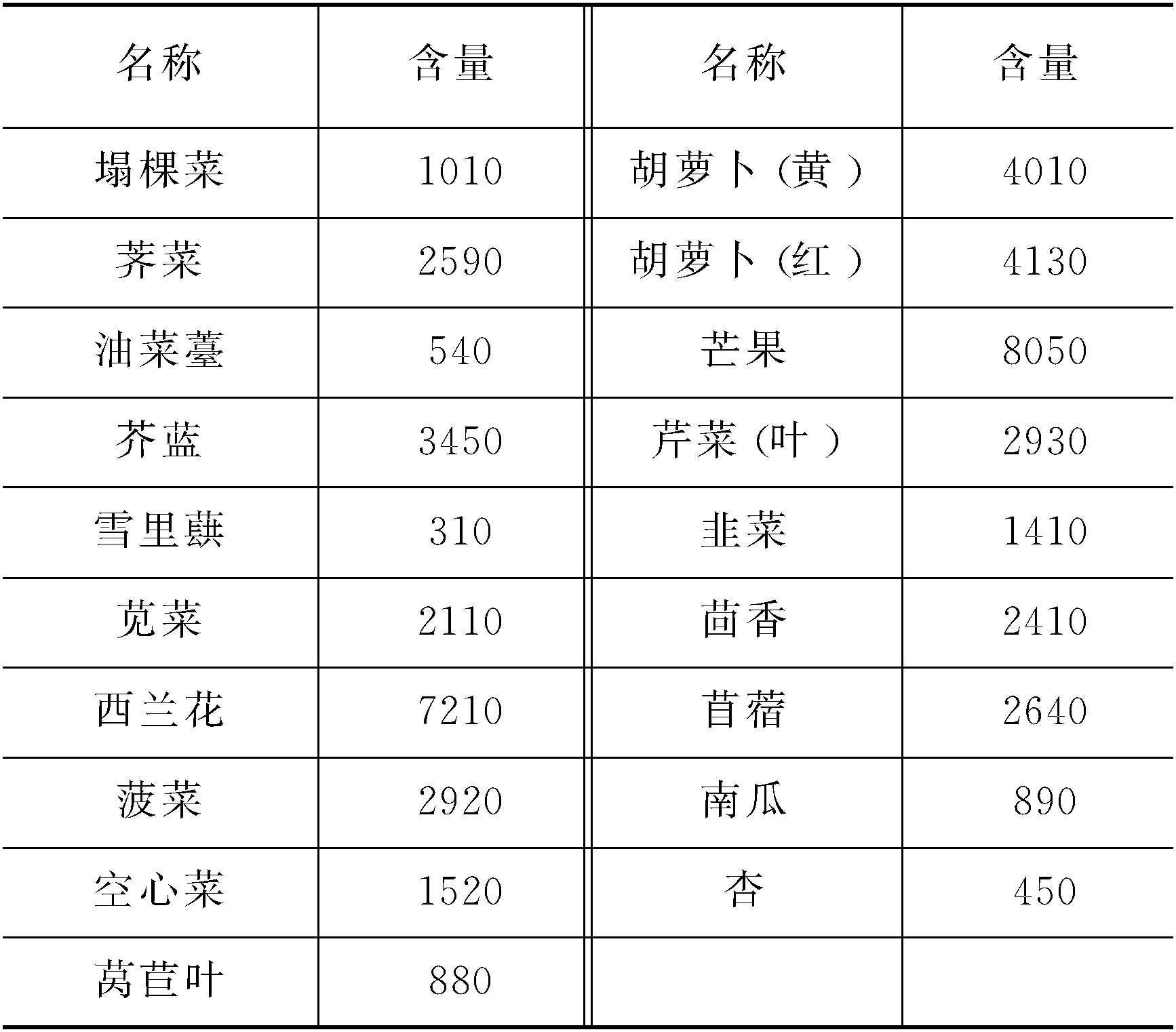 胡萝卜素是维生素A的前身,1 μg维生素A相当于6μg胡萝卜素。胡萝卜素被人体吸收后可转化成维生素A。含胡萝卜素较丰富的食物见下表(单位:μg/100g):
