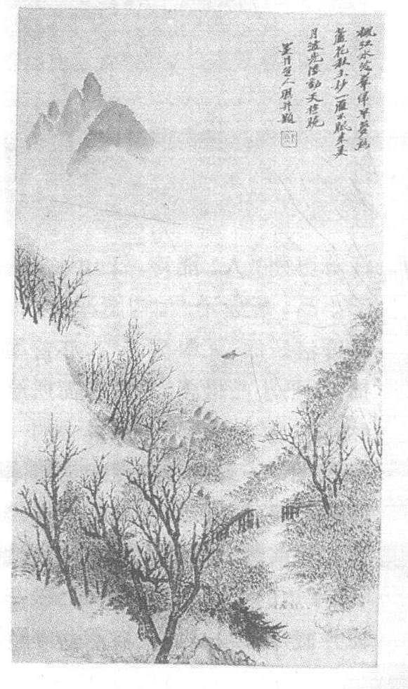 | 释义 | 吴历枫江群雁图页清。吴历(见《吴历湖天春色图轴》条目)绘。纸本设色。纵46.5厘米,横26.1厘米。江苏省南京博物院藏。此幅描绘了江野秋景。画面下部几棵落光了叶子的杂树,只剩下枯枝老干,丛林中的枫叶已经变成了黄褐色,喻示着时已深秋。溪水浅淡无声,静寂地流淌。溪边芦草丛生,水上木桥已经腐断。画面中部稀疏的乔木和密布的芦苇分列左右,排成V形,中间部分却是空荡荡的,泛出淡青色,依稀是秋夜中浩茫的江水,透出一股寒意。就在这空寥的背景上,一只大雁突然飞起,栖于坡地和芦苇丛中的雁群被它惊醒,有的伸颈张望,有的扭头回顾,神态非常生动。画面左上角云雾遮掩处露出几角峰尖,与近处景物相呼应,增加了辽阔深远的感觉。林木用干墨短笔细皴,苍老简淡;远山用淡墨烘染,朦胧而悠远。大雁只寥寥数笔就描绘出了绒毛的质感与生动的神态。画面的色调比较暗淡、清冷,呈现一种深秋晨曦的景象。但雁群的描写给这冷寂的自然注入了一股活力,尤其是那只向月直飞的孤雁,表现出一种执著的精神,情态感人。画上自题诗曰:“枫江水冷群归早,梦熟芦花秋末杪;一雁不眠来来月,波光浮动天将晓。”诗画相配,作者的意趣表达得更加完美,此幅是吴历为他的好友,苏州兴福寺默容禅师而作。
