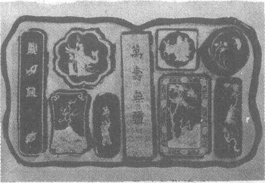 | 释义 | 吴天章集锦墨清。墨箱高35厘米,长27厘米,盒高4.3厘米,长24厘米,宽14厘米。上海博物馆藏。集锦墨是一种带有装饰性的成套丛墨,饰以金银彩绘,造成各种样式,作为宫廷品赏和文人间相互馈赠的礼品,盛行于明、清。吴天章造的这套集锦墨共有49锭,分别用五只墨盒合装于一墨箱。集锦墨造型多样,有的仿古代玉器圭、璋、璧、环,有的仿古代钟形、琴形、龙柱形、古钱形,仿动物的燕子、麒麟、云鹤、松鹿,还有八卦、海屋添寿、灵芝等。墨质地密,坚如玉,纹如犀,上饰以漱金,涂填粉彩,因而显得金碧辉煌,华丽精致,雕刻精工,微小处纤毫毕呈,清晰悦目。这套集锦墨数量多,造型图案精美,保存完好,堪称稀世之珍。吴天章,名倬,字天章,生于明崇祯年间,是清代的制墨名家,特别善制集锦墨。