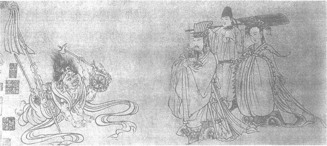 吴道子 《天王送子图》 此卷虽为后代摹品,却较好地保存了吴道子的画风。天神一边由于有神兽反对,武士降伏,气氛显得紧张激烈; 而净饭王一边则慈眉善目,笑靥盈盈。就连面目狰狞的神兽也不得不为圣婴降生跪拜,从而增添了静穆庄严的气氛。这紧张与安详,动与静,美与丑的对比,使画面高潮迭起,气势开合。加之用线刚柔相济,轻重顿挫变化富有节奏,极富生命力。很好地表现出人、兽、神不同的特征。尤其是那中间粗、两头细的线条,恰到好处地表现出人物衣纹的转折、叠压,衣带的飘举之势。整幅画显得气势豪放雄强,形象刻划颇能传神。其画风对后世白描人物画影响颇深。 吴道子(约685—758年)又名道玄,河南阳翟(禹县)人,幼年家贫,但年未弱冠已“穷丹青之妙”。后到洛阳从事寺观壁画制作,一生所作壁画有三百余间之多。唐玄宗时奉昭入宫作画。他的人物画“笔势圆转、衣服飘举”,人称“吴带当风”。千余年来享有“画圣”之誉,民间画工更是将其尊为“祖师”。 |