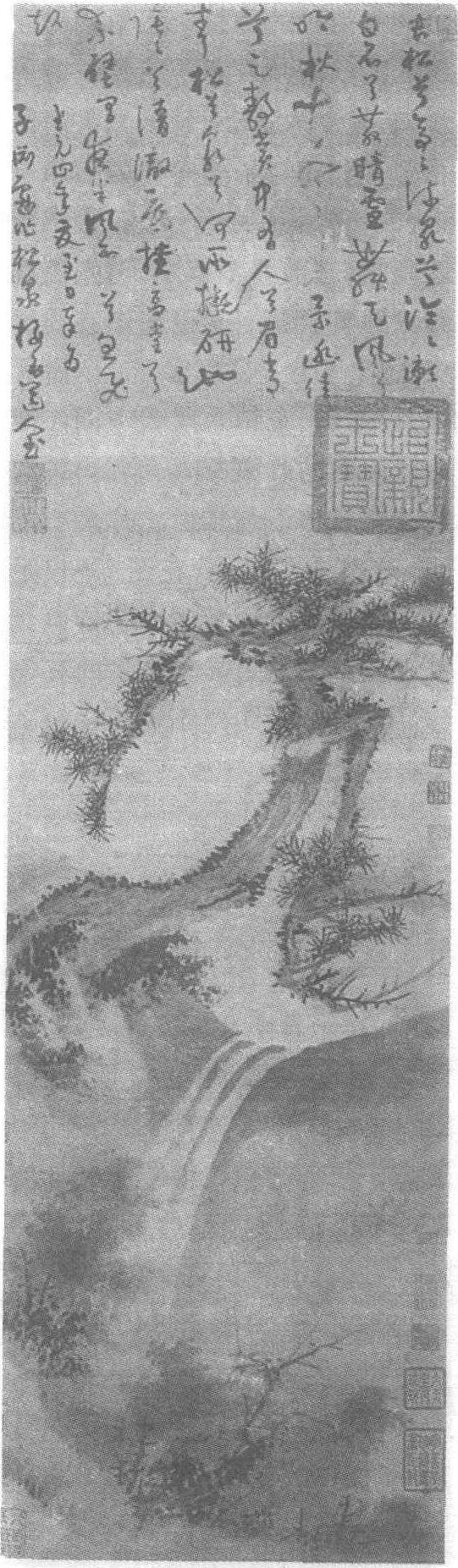 | 释义 | 吴镇松泉图轴元。吴镇(见《吴镇双桧平远图轴》条目)绘。纸本墨笔。纵105.6厘米,横31.7厘米,江苏省南京博物院藏。图中坡岭之上斜生一株奇松,健拔雄劲,有凌空之势,犹如一条腾跃而起的苍龙,曲挺的树干是龙的躯身,折转的枝权是龙的臂爪。松针稀疏,刚硬坚直。苔藓、杂草依树而生,松枝下流泉飞泻,隐没在山脚的灌木丛中。此图景色简单,平中带险,笔墨多变。松树的枝干以秃笔干墨勾皴擦染,松针则以细笔焦墨写成,坡岭灌木墨色温润,富有层次感。画幅上方作者自题诗云:“长松兮亭亭,流泉兮泠泠,漱白石兮散晴雪,舞天风兮吟秋声。景幽佳兮足静赏,中有人兮眉青青。松兮泉兮何所拟,研池阴阴兮清澈底。挂高堂兮素壁间,夜半风雷兮忽飞起。”款署:“至元四年夏至日,奉为子渊戏作松泉,梅花道人书。”下钤<梅花盦>、<嘉兴吴镇仲圭书画记>二印。至元四年为公元1338年,吴镇59岁。此图曾由孙承泽、安歧收藏。卷后有汪士鋐、高士奇、樊增祥、罗振玉等人的题跋。