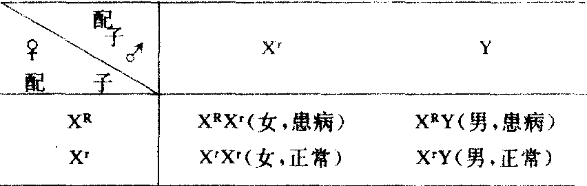 | 释义 | X显性伴性遗传X xianxing banxing yichuanX染色体上显性基因及其所控制性状的遗传,又称X显性遗传。人类的一种遗传病——抗维生素D佝偻病属于X显性遗传病。病症表现身材矮小、胸廓向前突出(“鸡胸”)。维生索D可促进正常人体对钙的吸收,但患这种病的人,利用维生素D的能力极低,因此,由于缺钙而致病。令X“代表X染色体上的抗维生素D的显性致病基因,Xt为相应的隐性基因,而Y染色体上没有相应的等位基因。如果一患病女子(XRXr)和一正常男子(XtY)结婚,其子代表现为: