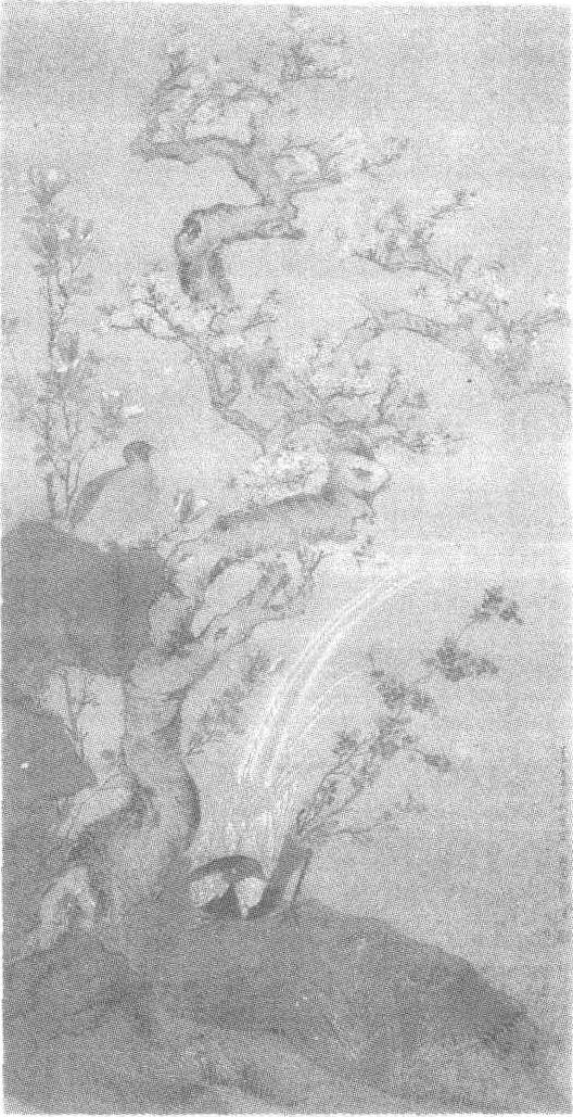| 释义 | 周之冕杏花锦鸡图轴明万历壬寅(公元1602年)。周之冕绘。绢本设色。纵157.8厘米,横83.4厘米。原藏周瘦娟的“紫罗兰庵”,现藏江苏省苏州博物馆。周之冕,生年不详,卒于万历(公元1573—1619年)末年。字服卿,号少谷,江苏吴县人。擅写意花鸟,融陆治设色工致和陈道复水墨写意法于一体,促进了水墨花鸟画的发展。他虽属“吴门画派”系统,但有明代院体传统的余辉。他还是“勾花点叶”法,(即画花用线条勾勒,画叶子用颜色直接点染)一派的代表。他的传世作品有《芙蓉凫鸭图轴》、《竹石雄鸡图》、《桂子图轴》、《梅花野雉图轴》、《花溪鸳鸯图轴》、《松兔图轴》等。此图描绘兀立的奇石,一虬屈粗壮的老杏树,枝桠盛茂,杏花簇簇,红白相映,分外鲜艳。树前坡石上,一只黑腹、白羽、红腿的锦鸡,长尾高扬,伏趴着,偏颈盯着其前面的两只蝴蝶花;树后石顶端,一只橙腹、黑羽、白爪的锦鸡,伫立辛夷下,斜视着欣欣向荣的杏花。图的右侧边缘,有署款“万历壬寅秋暮写,汝南周之冕。”并钤一方印。画面构图丰满,设色妍丽,笔墨工细秀润,尤其锦鸡羽毛的点染,细腻逼真,充分体现了作者描绘飞禽的本领。