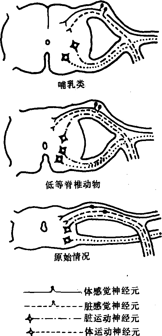 脊神经 成对由脊髓两侧发出,每体节一对,因数目随动物种类而有不同,少的如蛙只有10对,多的如蛇达500对以上。在羊膜类,每一脊神经以背根和腹根与脊髓连接,每一根由若干根丝组成。背根为感觉性,含有一般体传入和脏传入纤维; 在根丝集合处有脊神经节,主要为假单极感觉神经元的胞体所在。腹根为运动性,含有一般体传出和脏传出纤维;神经纤维由脊髓灰质内的运动神经元发出。两根汇合后,构成混合性的脊神经(图1)。 文昌鱼脊神经的背、腹根交错从脊髓发出,不合并,因此又称为背侧和腹侧神经。背根在正对两肌节之间分出,沿肌间隔分布至皮肤和内脏,为混合性,含有一般体传入、脏传入和脏传出三种纤维。脏传出纤维的胞体位于脊髓内。体传入和脏传入纤维的胞体或位于脊髓内,或分散于神经内,均为双极神经元,不聚集形成脊神经节。腹根特殊,由肌节的肌纤维构成,脊髓与运动神经元的突起形成运动终板。在圆口类,七鳃鳗的脊神经背根与文昌鱼相似,含有三种神经纤维,感觉神经元大多仍为双极性,但胞体已集中在背根上形成神经节。腹根除含有体传出纤维外,并有一些脏传出纤维; 盲鳗的背腹二根开始汇合,但不甚紧密。至圆口类以上,背腹二根经常汇聚集合。背根在许多硬骨鱼类仍含有许多脏传出纤维,而软骨鱼和四足动物只含传入纤维。软骨鱼类的背根感觉神经元为双极神经元,硬骨鱼类有双极、假单极和中间型神经元,两栖类主要为假单极神经元,羊膜类则几乎全为假单极神经元。腹根含有体传出和所有的脏传出纤维。至此,传入和传出两种纤维,分别集中构成背根和腹根。背腹二根集合为脊神经干后,又分为三支: 背支分布于躯体的轴上部结构; 较粗的腹支分布于轴下部包括附肢的结构; 第三支为脏支,又称交通支,分布于内脏。这三支都含有传入和传出纤维。腹支在相当于附肢处形成神经丛,至四足动物成为复杂的臂丛和腰荐丛。 脑神经 有13对,前2对连接于大脑,其余均由脑干发出。它们是根据在哺乳类的前后顺序和功能而排列并命名的,即端神经(0)、嗅神经(Ⅰ)、视神经(Ⅱ)、动眼神经(Ⅲ)、滑车神经(Ⅳ)、三叉神经(Ⅴ)、外展神经(Ⅵ)、面神经(Ⅶ)、位听神经(Ⅷ)、舌咽神经(Ⅸ)、迷走神经(Ⅹ)、副神经(Ⅺ)和舌下神经(Ⅻ)。端神经发现较晚,其他脑神经业已排定,所以列为O对。脑神经可分三类。第一类相当于七鳃鳗脊神经的背根,含有三种神经纤维,仅少数神经无脏传出纤维。它们与鳃弓和鳃裂相联系.因此又称为鳃神经类,包括O、Ⅴ、Ⅶ、Ⅸ、Ⅹ及Ⅺ。第二类相当于腹根,包括Ⅲ、Ⅳ、Ⅵ及Ⅻ,为体运动神经类,分布于头部和枕部肌节演生的横纹肌。第三类包括Ⅰ、Ⅱ和Ⅷ,分布于脊椎动物头部的鼻、眼和耳及侧线器官,含有特殊体传入纤维,属于特殊感觉神经类。此外,有些脑神经中含有特殊脏传入和特殊脏传出纤维。含传入纤维的脑神经,一般具有脑神经节。但本体感觉传入纤维的胞体有的不在神经节,而位于脑神经核内(图2)。