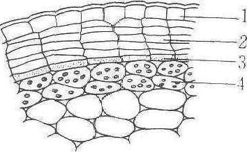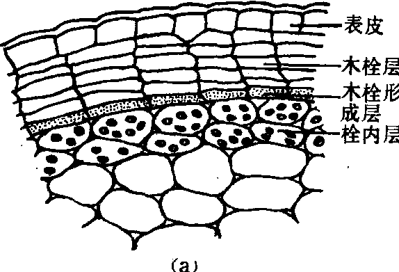 周皮 1.表皮 2. 木栓层 3. 木栓形成层 4. 栓内层 |