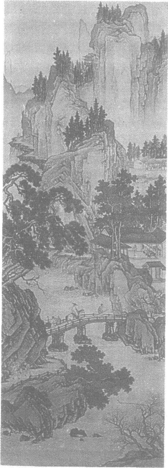 | 释义 | 周臣春山游骑图轴明。周臣(见《周臣桃花源图轴》条目)绘。绢本设色。纵185.1厘米,横64厘米。北京故宫博物院藏。此图画的是春山游骑,是传统的春游、行旅题材。远处春山高耸云间,飞瀑高悬,殿宇楼阁点缀其间。松柏和杂树葱绿茂密,春意盎然。在蜿蜒的盘山路上,有点点行人在登山。近景一条小溪流水潺潺,溪上横卧一桥,游骑和行旅正在过桥向山脚下的客店走去。客店中已有三、五行人在歇息、吃饭。构图稳重,用笔精工,气韵酣畅,气势雄浑。雄秀中有逸气,繁复中见清旷。淡设色。山石用细密凝重的小斧劈皴,人物用细线淡色。此图融合了郭熙、李唐等人的画法,自成风貌,别具新意。是周臣山水画的代表作。署款“东村周臣”,钤<东村>印。