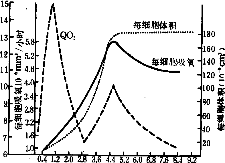 ❶ 均为25℃下每分种的O2吸收量(Qo2 ); 有些数据是按 Q10=2从其他温度换算的。 ❷ 海芋的呼吸速率是放热呼吸的最大报道值。 植物器官的呼吸 种子呼吸 种子的呼吸速率与含水量密切有关。一般油质种子含水量低于8~9%、淀粉质种子含水量低于11~12%时,呼吸作用不明显。当油质种子含水量达到10~11%、淀粉质种子含水量达到15~16%时,呼吸作用便显著增强。如果含水量继续提高,呼吸速率几乎直线上升。所以贮藏谷物时,控制含水量极为重要。如小麦进仓时含水量要求低于12%,水稻低于13.5%,油料种子低于9%,含水量高于此值时呼吸速率剧增,养分消耗加大,粮堆温度提高,致使种子生活力迅速下降。种子在萌发过程中呼吸速率有一定的变化。种子吸水开始萌发阶段称水化阶段,此时呼吸速率随种子相对含水量的提高而增强,这是由于干燥种子呼吸系统的再活化,对温度不敏感。水化阶段之后,呼吸速率继续缓慢上升,这阶段的呼吸决定于代谢活性,对温度敏感,同时与幼苗的形态变化相关。 根呼吸 根的呼吸作用与矿质吸收以及生长和分化关系密切。以干重为单位计算的最大呼吸速率出现在分生区,即距根尖0.4~1.6mm处。若以细胞为单位计算,则分生区呼吸速率最低,在细胞完全伸展之前达到高峰,然后略有下降(图1)。 -Qo2