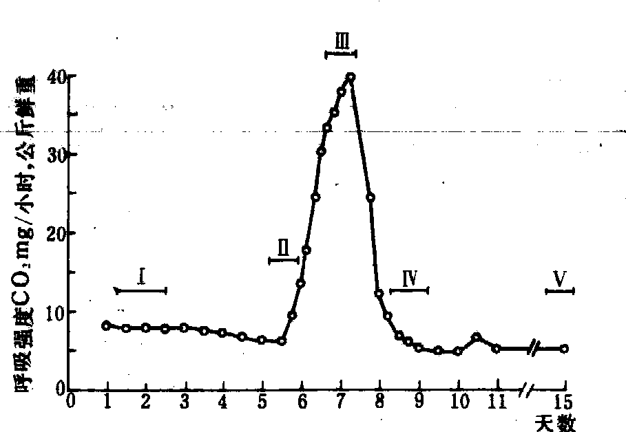 果实呼吸 果实成熟过程中的呼吸变化有两种类型。一类有呼吸跃变,如苹果、梨、香蕉、番茄、草莓等属此。另一类无明显呼吸跃变,如柑桔、瓜类、无花果、菠萝等属此。呼吸跃变指果实成熟到一定时期呼吸速率的陡增。跃变的呼吸速率的高峰值可以超过高峰起始前5倍之多。呼吸跃变的出现意味着果熟可食,高峰后果实迅速衰老,呼吸速率骤降。呼吸跃变的出现与温度及乙烯有关。果实贮藏期降低温度和控制周围气体成分,可以推迟呼吸跃变的出现(图2)。