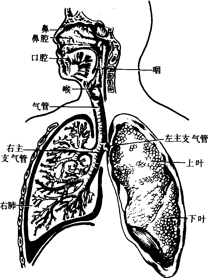 哺乳动物的肺最为完善,气体交换率极高。肺体积大,几乎占据整个胸廓,呈海绵状,具有弹性。多数动物呈分叶状,鲸类、海牛类、长鼻类、奇蹄类和蹄兔类等不分叶。肺实质由一再分支的支气管树和具呼吸性的分支管泡状结构组成,肺泡为哺乳动物所特有,是进行气体交换的场所。喉具有哺乳类特有的会厌软骨,其表面被覆粘膜,两者构成会厌,呈叶片状,基部固定,尖端游离并向舌根翻转,当吞咽时,能将喉口关闭而防止食物误入喉内。喉腔内侧壁有一对粘膜褶,称声带,是喉的发声器官。鲸类的喉向前延伸入鼻咽部,当鼻孔喷水时,喉可吸入空气。除鲸类和海牛类的气管较短外,其他哺乳类的气管较长。哺乳动物的呼吸运动由肋骨的位移和膈的升降以改变胸腔的容积来实现。 鳔 肺鱼的鳔与陆生脊椎动物的肺相似,也发生于咽后方腹侧壁。鳔内有许多小气室,并从气室伸出许多肺泡囊,像肺一样用以进行气体交换。 辅助呼吸器官 鲶鱼、弹涂鱼、肺鱼、黄鳝和两栖类等皮肤内有丰富的血管,能进行呼吸。黄鳝的咽腔、泥鳅的肠管、攀鲈的鳃上器以及水栖龟鳖类泄殖腔伸出的副膀胱(见泌尿系统)等均分布有丰富的毛细血管,也都是辅助呼吸器官。 呼吸系统huxi xitong人体与外界空气进行气体交换的一系列器官的总称 (见图),包括鼻、咽、喉、气管、支气管及由大量的肺泡、血管、淋巴管、神经构成的肺,以及胸膜等组织。临床上常将鼻、咽、喉称为上呼吸道,气管以下的气体通道 (包括肺内各级支气管) 部分称为下呼吸道。在呼吸系统中,各器官都有一定的分工,从鼻到各级支气管是负责传送气体,其中鼻腔有加温、湿润和清洁空气等作用,还能在发音时产生共鸣。咽不但是呼吸的通道,而且还是食物的必经之路,讲话时可起共振作用。喉是呼吸道中的特殊部分,兼有发音的功能。肺是气体交换的器官,它通过肺泡吸入氧,放出二氧化碳。呼吸系统的结构特点是由骨或软骨作为支架,当气体出入时,呼吸道的管壁不会塌陷,使气流畅通。整个呼吸道有三道保护屏障,一是鼻毛阻挡细菌、病毒和灰尘进入呼吸道;二是气管上皮细胞分泌的粘液将灰尘粘住并随粘膜上皮的纤毛运动将其排出; 三是肺泡内有一种细胞可吞噬肺泡内的灰尘。通过这三道屏障,保证了交换的气体是洁净的。人体借助于呼吸系统与外界进行气体交换,空气由呼吸道进入肺泡,空气中的氧气从肺泡进入毛细血管的血液,经循环送遍全身,供组织细胞利用。与此同时,组织代谢产生的二氧化碳经血液循环运至肺部,通过呼吸系统排出体外。