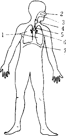 1.肺2.鼻3.口4.喉5.气管6.支气管7.膈 人体呼吸系统 咽是一个肌性管道,其上部与鼻腔和口腔相通,下部与喉和气管相通,它是食物与气体的共同通道。气管由十几个“C”形软骨环和其间的平滑肌构成,软骨使气管维持开放状态,保持气体通畅。平滑肌可改变气管口径,有利于居于其后方的食道扩张,便于食物下行。气管与支气管粘膜中有腺体,能分泌含多种免疫球蛋白(抗体)的粘液,具有抑菌、抗病毒的作用;而且粘膜上皮细胞表面有纤毛,它能不断地向喉的方向摆动,将粘有灰尘的粘液上移,最后咳出体外,形成痰。痰中含有大量的细菌和病毒,因此不要随地吐痰,污染环境。 肺是呼吸系统中最重要的器官。成人肺内含有3—4亿个肺泡,它是细支气管反复分支而成,其壁薄,由单层上皮细胞构成,外面包绕着毛细血管网,是气体交换的场所。据估计,肺内进行气体交换的总面积约为100m2。但在安静时,气体交换仅由部分肺泡完成,面积约为40m2;运动时面积可增至70m2。胸腔有节律地扩大和缩小,称为呼吸运动,是依靠呼吸肌的收缩和舒张进行的。呼吸节律受中枢神经系统控制。膈肌是最重要的呼吸肌,它介于胸腔、腹腔之间,收缩时使胸腔的上下径加大,产生吸气,舒张时产生呼气。肺活量是表示最大吸气后,尽力呼出的气体量,反映了每次肺通气的最大潜力。可用肺量计测定。正常成年男子平均肺活量为3 500毫升,女子为2 500毫升。 儿童和少年的呼吸道比成人短且窄,组织较嫩,粘液分泌少,易受感染或损伤。儿童的肺,胸廓和呼吸肌均未发育成熟,肺活量小,由于儿童期代谢旺盛,需氧量大,因此呼吸频率较快,一般为20—25次/分。正常成人为16—18次/分。因此对生长发育期的儿童和少年,应保持各场所空气新鲜,湿润,温和,尽量做到开窗睡眠;经常参加体育锻炼,增强呼吸机能;在冬天要多进行户外活动,坚持用冷水洗脸,以提高呼吸系统的抵抗力。 呼吸系统由鼻、咽、喉、气管、支气管和肺组成。从鼻到支气管是气体的传送通道,并有温暖吸入的空气和清除空气中的灰尘及细菌的作用。肺的作用是完成机体与外界之间的气体交换,即肺毛细血管内的二氧化碳与吸入肺的空气中的氧进行交换。呼吸系统尚包含一些执行特殊机能的结构,如喉部含有能够发声的声带,鼻腔含有嗅觉感受器等。 呼吸系统呼吸系统指人和动物与外界环境进行气体交换的一系列器官的总称。人的呼吸系统是由呼吸道和肺组成的。呼吸道包括鼻、咽、喉、气管和支气管。呼吸系统的主要功能是实现机体与外界环境之间的气体交换,即吸入氧,排出二氧化碳。