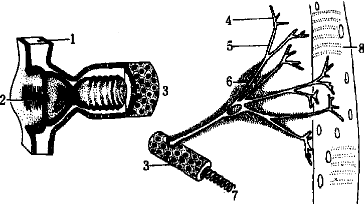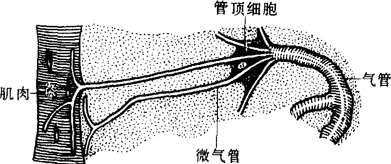 图 2 气管分布模式图 (仿Щванвич) 微气管 是气管分支为直径2~5微米时进入星形端细胞后又分支为直径约1微米的薄壁盲管,内有直径约为0.025微米的螺旋丝(图3),蜕皮时不随表皮脱落。微气管壁有通透性,末端充满组织液,周围组织代谢率改变或代谢物增减时,管内液体受渗透压影响而进退,从而调节空气进入的量。