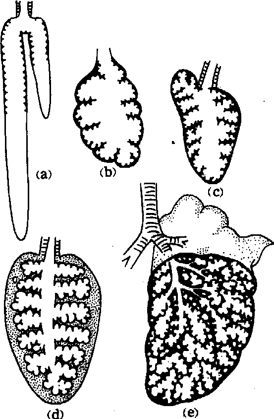 此外,陆生蜗牛的外套膜内壁密布血管网,如肺一样进行气体交换; 蝎目和蛛形纲则有很多薄膜状鳃片重迭排列形成的书肺作为呼吸器官。 脊椎动物的呼吸器官 主要有鳃(水栖动物)、肺及呼吸道(陆栖动物)等。肺鱼和总鳍鱼的鳔还具有肺的功能。此外,尚有一些辅助呼吸器官。 鳃 由咽部侧壁发生。在胚胎期,咽侧壁内胚层形成成对的鳃囊向外侧伸展,其相应的外胚层内陷形成鳃沟,两者穿通形成鳃裂。前后鳃裂之间的实体为鳃间隔,内缘有软骨质的鳃弓支持。鳃间隔前后两侧发生无数鳃丝,排列组成鳃瓣,每一鳃丝两侧又生出许多细小的鳃小片,是进行气体交换的部位。圆口类的鳃丝密布于鳃囊内壁,每一鳃囊以内鳃孔与咽相通;以外鳃孔与体外相通。软骨鱼的鳃间隔发达,两侧着生鳃丝,鳃裂开口于体表,被鳃间隔和皮肤相延续形成的皮褶覆盖。硬骨鱼的鳃间隔退化或消失,鳃丝着生于鳃弓上; 整个鳃外覆有宽广的鳃盖,形成鳃腔,并以弧形缝状的鳃盖裂开口于体表。鳃进行呼吸要有大量水流通过,水的吸入和排出主要依靠上下颌和鳃部肌肉的活动,一般是水流从口进入咽腔,经鳃部进行气体交换,再由鳃裂或鳃盖裂排出。 肺与呼吸道 由胚胎期咽后端腹侧的内胚层分化发育而来。起先为一盲管,沿食管腹面向后延伸。以后前部演变为喉,中部形成气管,末端膨大分支形成左、右肺。水生有尾两栖类成体,保留三对外鳃,以鳃呼吸及皮肤呼吸为主,肺的结构非常简单(图2),一般为两个细长的囊,内壁平滑或稍显皱褶。以陆栖为主或水陆两栖的无尾类,以肺呼吸为主,皮肤呼吸为辅; 肺呈椭圆形的薄壁盲囊,内壁形成许多复杂的漏斗状皱褶。蛙的呈蜂窝状,以增加与空气接触的面积。无尾两栖类的呼吸道极短,喉与气管分化不全,称喉气管室。有尾两栖类具有一定长度的气管。两栖类不具胸廓,以一种特殊的口咽运动进行吞气式呼吸。爬行类的肺虽呈囊状,但较两栖类的结构有很大发展。一般左右成对,有些种类为前后排列,或一侧不发达甚至退化,如某些蛇类,左肺大都退化或缺如; 肺内表面由许多分叉的隔分成蜂窝状小室,与细支气管相连,使整个肺呈海绵状; 避役肺的后端伸出一些薄壁的气囊,与鸟类的气囊相似。爬行类的喉多数不能发声,气管进一步加长,有不完全的软骨环支持,分支成左、右支气管入肺。爬行类已有胸廓,虽然有时也进行吞气式呼吸,但主要是利用肋骨的运动使胸腹腔扩大和缩小,进行吸气式呼吸。鸟类由于飞翔的原因,其新陈代谢率较高,耗氧量较大,因而肺的结构进一步复杂化(见鸟纲),左右肺呈海绵状,紧贴于胸廓背壁肋骨之间,体积不大,不分叶,弹性较小; 支气管入肺后延伸分支为初级、次级和三级支气管,三级支气管及其周围的呼吸毛细管组成肺小叶,呼吸毛细管是进行气体交换的场所,在初级支气管和部分次级支气管的末端,向肺外膨出形成薄壁膜质的气囊,扩展于体内(见肺)。鸟类的喉不发达,无声带; 气管很长有完整的半骨化的软骨环支持,有的气管盘绕在胸骨内面或下面如鹤、鹅等; 在气管与左、右支气管交界处有鸣管,是鸟类特殊的发声器。鸟类在平时借肋间肌和腹肌的作用改变胸廓容量进行呼吸,飞翔时胸廓稳定,则依靠气囊辅助呼吸,呼吸方式为双重呼吸(见肺呼吸)。