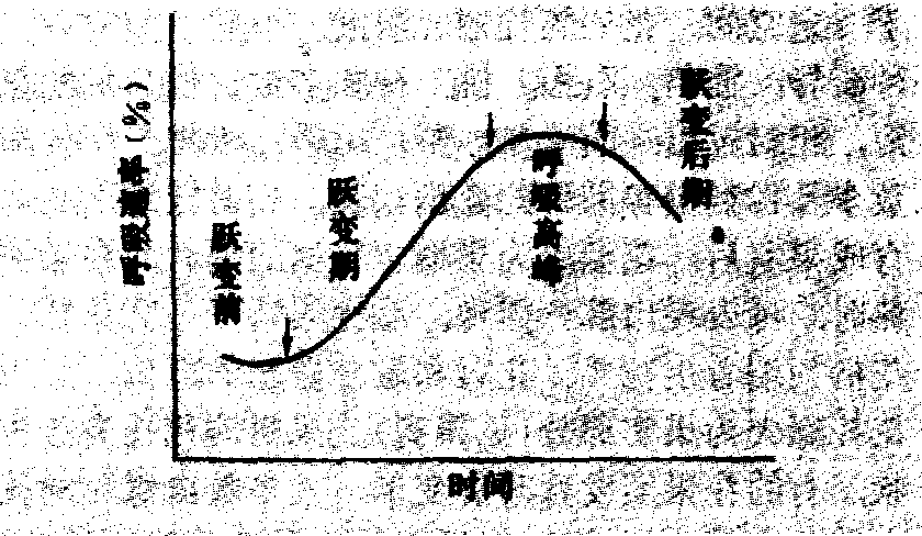 时间 图1 跃变型和非跃变型 在稳定温度下,呼吸跃变的进程可划分为如下阶段: 呼吸上升前, 呼吸速率最低的时期称为跃变前期; 呼吸速率上升时为跃变期或呼吸上升期, 达到最大值时为高峰期; 最后呼吸下降为跃变后期(图2)。 不同种类果实呼吸跃变进程持续的时间长短, 以及达到的最大峰值虽很不相同,但在呼吸上升的同时,与成熟作用有关的生理生化变化积极活跃, 合成反应旺盛进行,有新的核酸、蛋白质(酶)形成。呼吸高峰以后, 分解反应逐渐占主导, 组织结构逐渐解体、崩溃, 最后死亡。