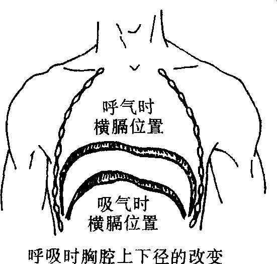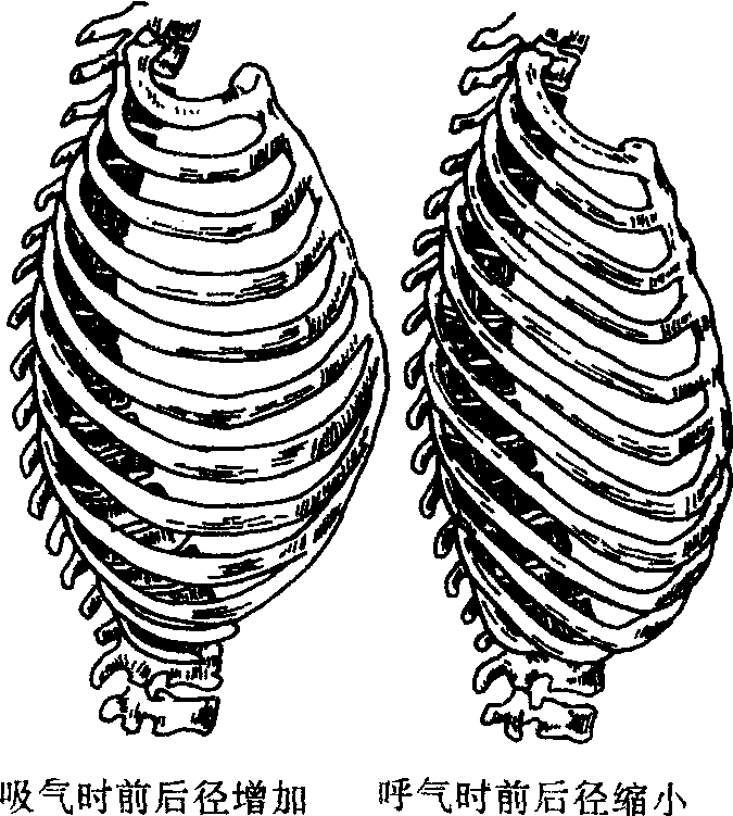 图1.6-7 呼吸时胸腔容积的变化 呼吸运动huxi yundong胸腔有节律地扩大与缩小。呼吸运动由胸、腹部许多肌肉的收缩与舒张所引起。如位于肋骨之间的肋间外肌、肋间内肌和作为胸腔、腹腔间隔的膈肌等。平和吸气时,膈肌的收缩使胸腔的上、下径增大,而肋间外肌的收缩,使肋骨上提并略向外翻转,同时将胸骨推向前上方,导致胸腔的前后、左右径扩大。由于胸腔容积增大、肺内压降低,形成与大气之间的压力差,外界气体经呼吸道流入肺内,完成吸气动作。平和呼气时,膈肌和肋间外肌舒张,肋骨由于重力作用而下降,膈肌则由于腹内压的作用而回位,使胸腔缩小,肺也随之缩小,肺内压升高,高于大气压,肺内部分气体被呼出。用力吸气时,除肋间外肌和膈肌的收缩比平时加强外,其它辅助的吸气肌,如胸大肌等也参加收缩,以加强吸气动作:用力呼气时,除肋间外肌和膈肌舒张外,肋间内肌收缩,以加强呼气动作。 呼吸运动指胸腔有节律地扩大与缩小的活动。呼吸运动包括吸气和呼气。 呼吸运动respiratory movement因呼吸肌的舒缩,引起胸廓节律性的扩大和缩小。肺和外界环境间的气体交换是由于肺内外的压力差引起的。肺扩大时,肺内压小于大气压,气体由外界进入肺内,引起吸气。反之,则引起呼气。肺本身没有舒缩能力,它的扩大和缩小依赖于胸廓的活动。胸廓容积的变化则是由于呼吸运动所引起。吸气肌(主要为肋间外肌、膈肌)收缩引起胸廓扩大而吸气,呼气肌(主要为肋间内肌和腹肌)收缩引起胸廓缩小而呼气。由肋间肌和膈肌协调活动引起的呼吸运动称胸腹式呼吸;主要由肋间肌活动引起的称胸式呼吸;主要由膈肌活动引起的称腹式呼吸。 |