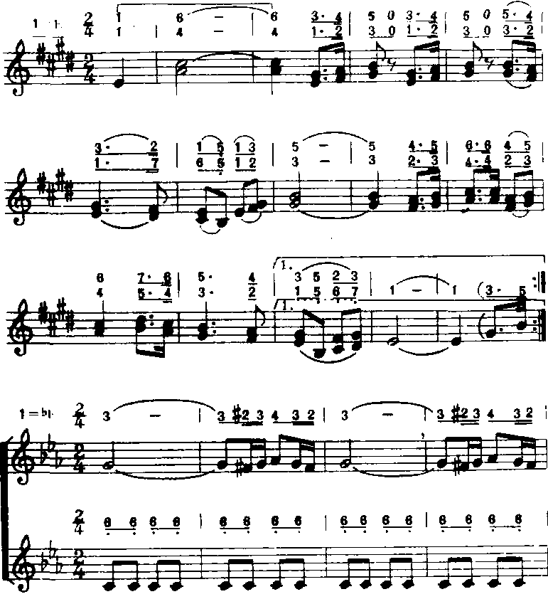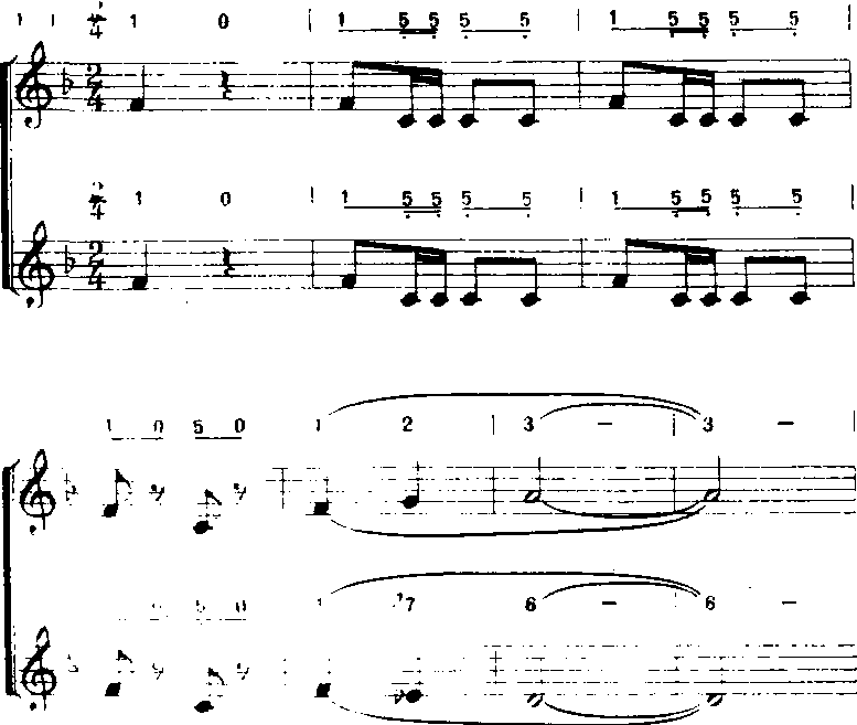 在二部合唱写作中,以上三种进行是结合起来应用的。和声式二部写法以同向进行为主,多而广,斜向进行和反向进行为辅。总之,任何一种方法都不能离开歌曲主题思想和音乐形象的需要,只要是符合需要的就是合理的和可行的。 |