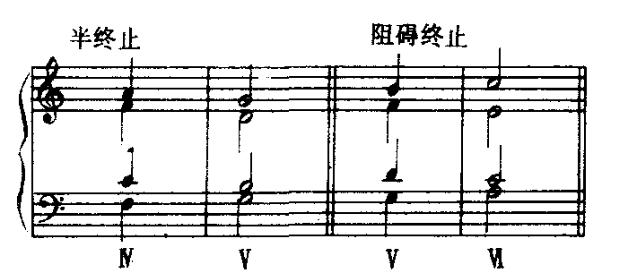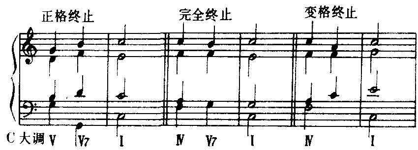上述终止式中,前三种用稳定的主和弦结束,称为稳定终止;后两种用不稳定的和声结束,称为不稳定终止。在稳定终止中,如果由原位的属和弦或下属和弦进入处于强拍上的、旋律位置在根音的原位主和弦,则称为完满终止;如果前面的属和弦或下属和弦采用转位形式,或者主和弦处于弱拍或旋律位置在三音或五音上的,均属于不完满终止。 |