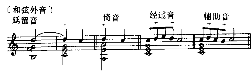 和弦外音按其性质可分为强和弦外音和弱和弦外音两类。强和弦外音指与一个和弦同时出现的和弦外音。它具有强烈、紧张的音响。强和弦外音包括延留音和倚音。延留音简称留音,是前一和弦中的音延留到后一和弦而构成的和弦外音。如例中 “+”所示: