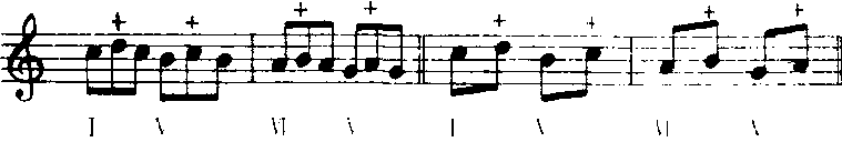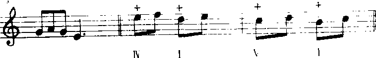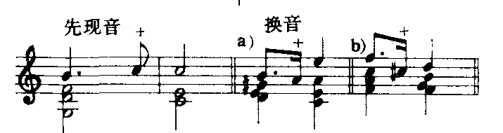换音是介于两个不同和弦音之间,与一方构成级进而与另一方构成跳进的音,也叫跳进的助音。如例中“+”所示。