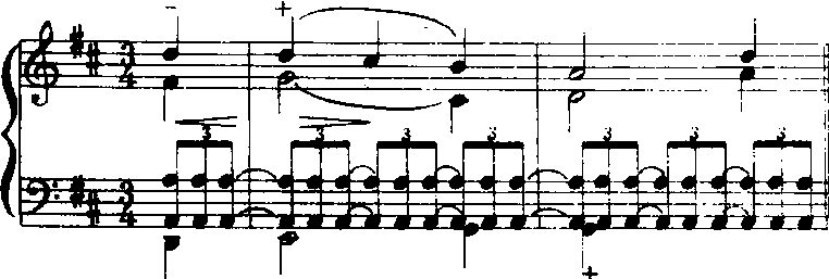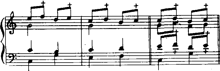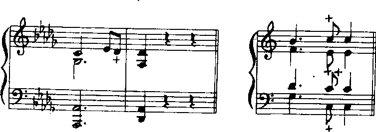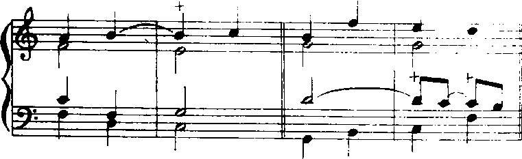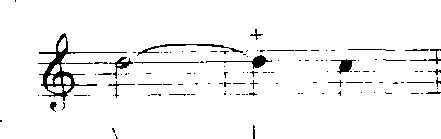 倚音是与和弦其他各音同时发声的和弦外音。它可能是前和弦中的和弦音。如例中“+”所示: